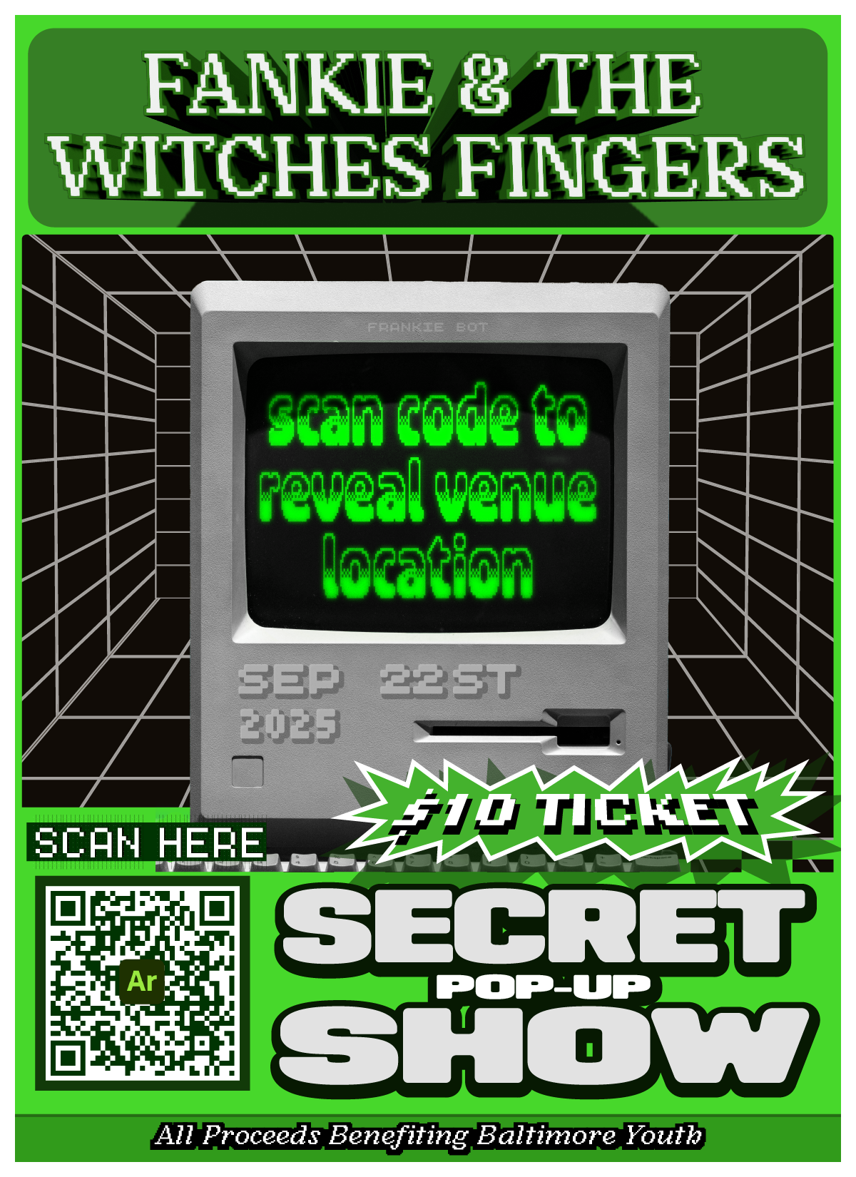 This poster was made for Frankie and the Witch Fingers annoicing a pop-up concert that would be announced using posters around baltimore were you can scan to reveal the location of the venue